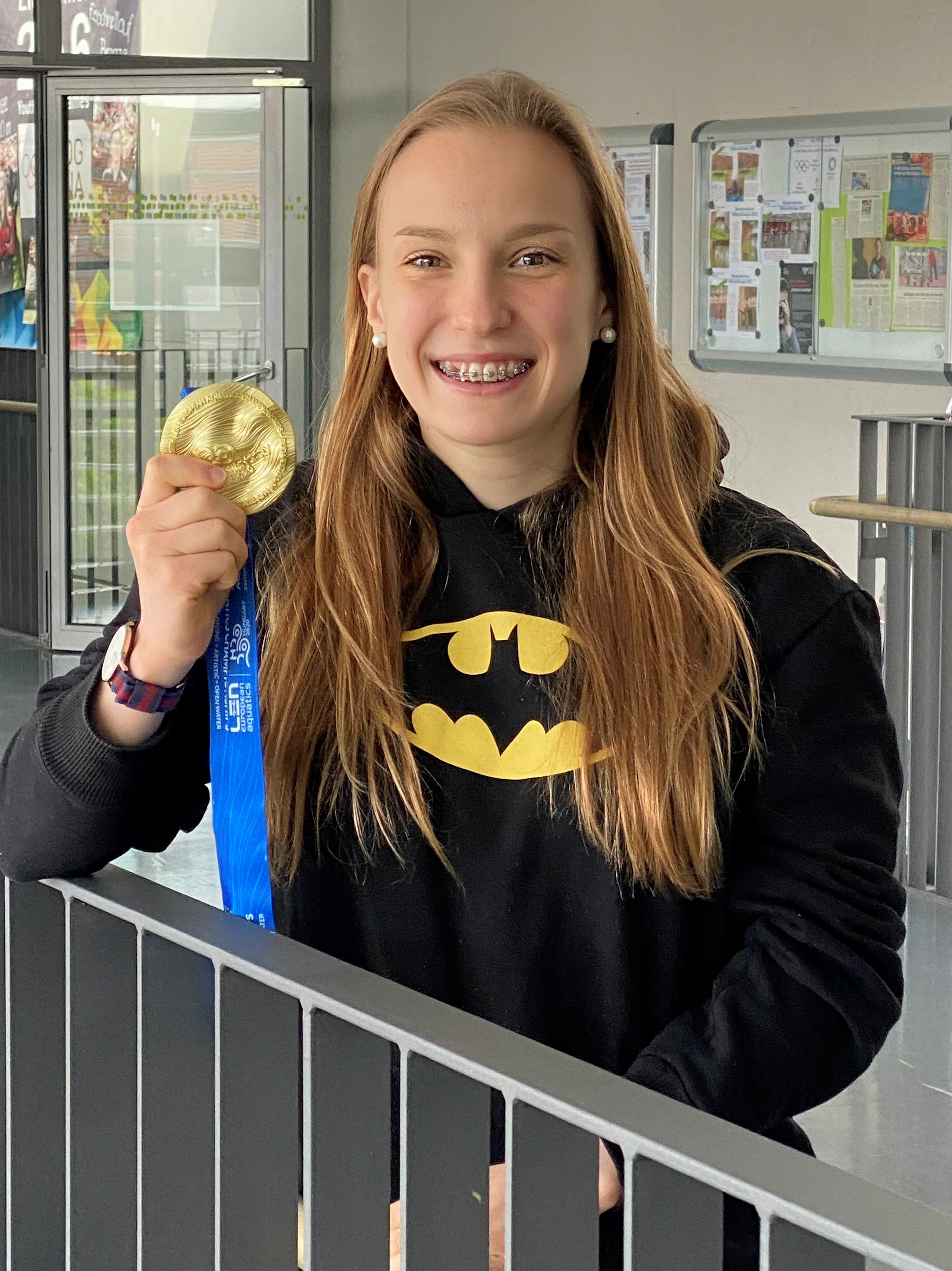 Gemeinsam mit ihrer Partnerin und ehemaligen Schülerin unserer Schule Tina Punzel holte Laura Hentschel (12S) bei der Europameisterschaft im Synchronspringen in Budapest Gold vom 3m-Brett. Mit 307,29 Punkten siegten sie knapp vor Italien und Russland.