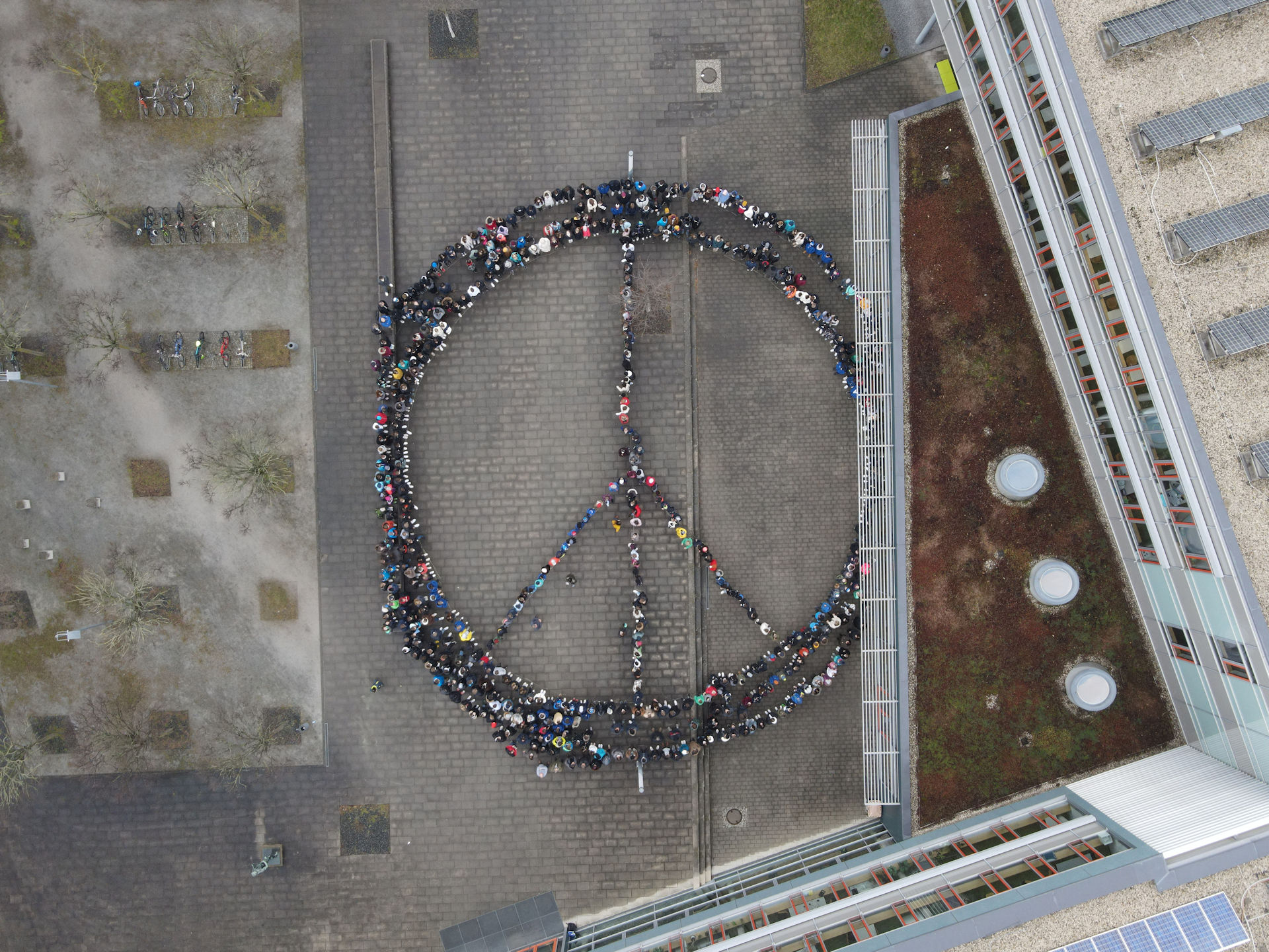 In den letzten Tagen fanden in vielen Formen Gespräche und Aktionen statt, die sich mit dem Krieg in der Ukraine beschäftigten. Am Freitag versammelten sich Schüler, Lehrer und Mitarbeiter des Sportschulzentrums auf dem Schulhof, um ein Zeichen für den Frieden zu setzen.