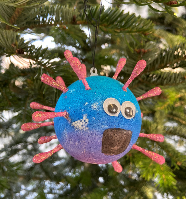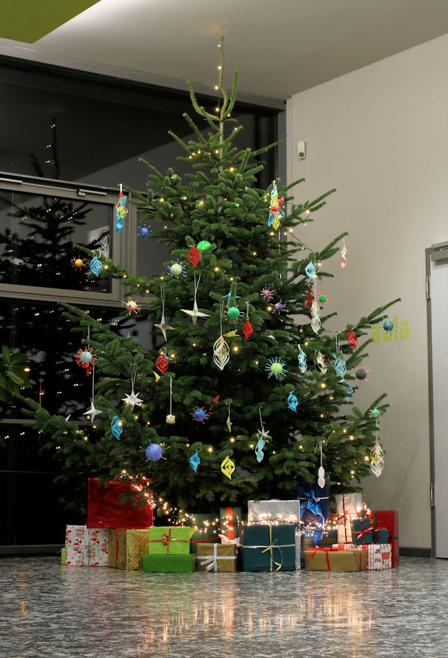 "Uiii, der ist aber schön, so grün... und wie der strahlt! Und guckt mal, der hat sogar seine Spitze eingezogen, damit er nicht an der Decke anstößt. Und der Baumschmuck - alles selbst gebastelt. Ganz oben hängt zwar nüscht, aber die Fünfer sind ja auch noch ziemlich klein. Aber Moment mal, ist der Baum etwa auch krank? Diese kleinen Kugel sehen doch aus wie Corona-Viren! So sehen die also aus! Bloß nicht zu nah ran gehen! ...