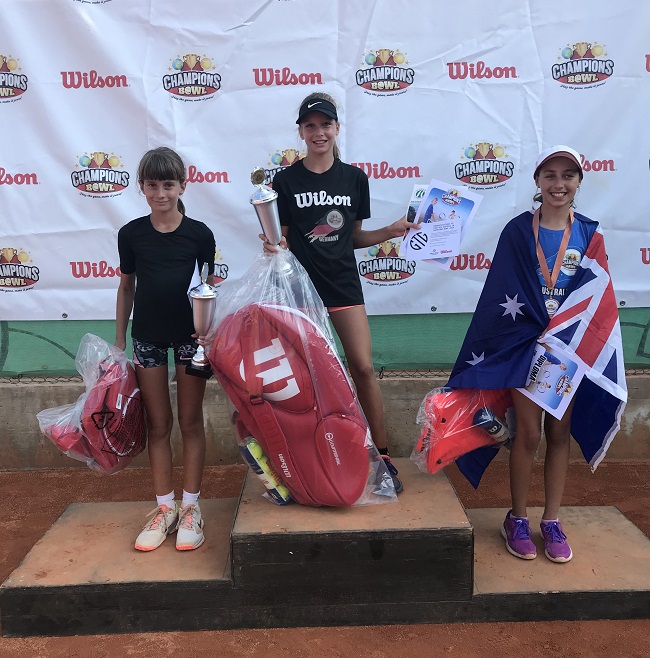 Auch die Zwillinge Josy und Emma Daems vom Tennisverband Niedersachsen-Bremen waren mit von der Partie. Nachdem die lange aber kurzweilige Anfahrt am Sonntag vollbracht war, wurden erst einmal die Hotel- und Tennisanlagen inspiziert. Bei der Eröffnungsveranstaltung am Montag liefen alle teilnehmenden Nationen unter Applaus der vielen Zuschauer und angeführt von den Fahnenträgern ins Tennisstadion ein. Im weiteren Verlauf wurden dann die jeweiligen Konkurrenzen ausgelost. Gespielt wurde im Einzel und im Doppel. Bei den Einzeln mussten sich die Teilnehmer in Gruppenspielen für die anstehenden Hauptrunden qualifizieren. Diese Hürde nahmen drei STV-Spieler mit Bravour. In der Hauptrunden hingen die Trauben dann schon etwas höher. Ansgar Thiele musste sich dort einem Spieler aus der Ukraine geschlagen geben. Felix Neumeister gewann sein erstes Spiel gegen einen Spieler aus Mexico, in der zweiten Runde unterlag er aber nach langem Kampf einem Spieler aus Polen. Lola Giza siegte in der ersten Runde in einem hart umkämpften Match in drei Sätzen gegen eine Spielerin aus Serbien. Aber damit sollte es noch nicht genug sein. Lola erreichte mit einem weiteren Sieg das große Finale. Mit Unterstützung der gesamten deutschen Delegation rang sie ihre Gegnerin aus Bosnien in über vier Stunden im entscheidenden dritten Satz nieder und konnte bei der anschließenden Siegerehrung den begehrten Pokal in Höhe strecken. Aber nicht nur auf dem Tennisplatz fielen unseren Tennisspieler positiv auf. Ihr faires, freundliches aber auch professionelles Auftreten wurde auch von anderen Nationalcoaches positiv zur Kenntnis genommen. Als Resümee sagte Stefan Dörfert, es war für die Kinder eine super Erfahrung und hat allen viel Spaß gemacht. Einer Wiederholung im nächsten Jahr sollte also nichts im Wege stehen.