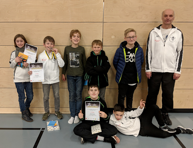 Bild: Trainer Hubert Peche mit Kampfrichter und sechs Fechtern