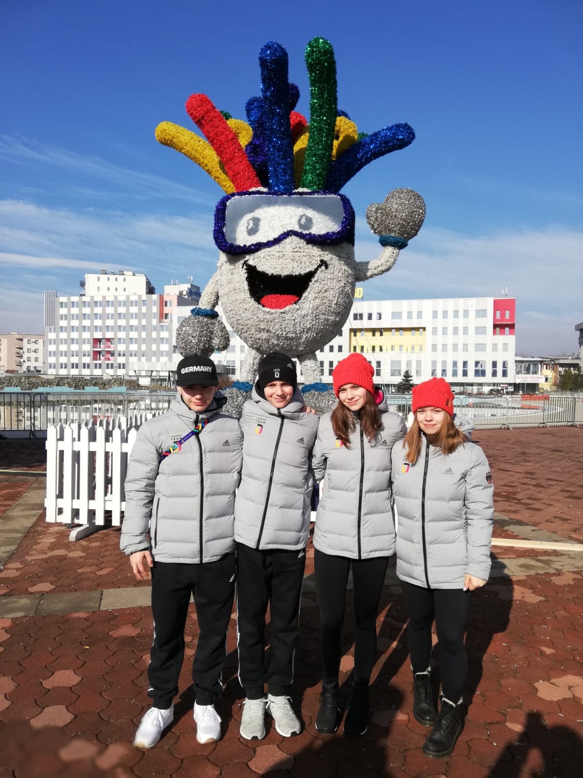 Das Team Germany um Jonas Hammermüller und Anna Baber (EVD e.V., Kl. 9S1) wurde verstärkt um zwei weitere Sportler: Til Schäfer (Mannheim) und Svea Rothe (Turbine Rostock). Zusammen sammelten sie viele neue und spannende Eindrücke. Leider gab es bei der Anreise Probleme mit dem Gepäck, das dann nach und nach erst eintraf und sogar den ersten Wettkampftag betraf. Es konnte also teilweise nicht mit dem eigenen Material gelaufen werden und kostete sicher einige wichtige Hundertstel und Zehntel.