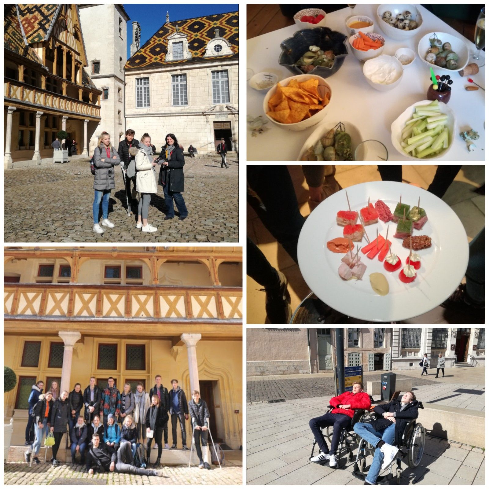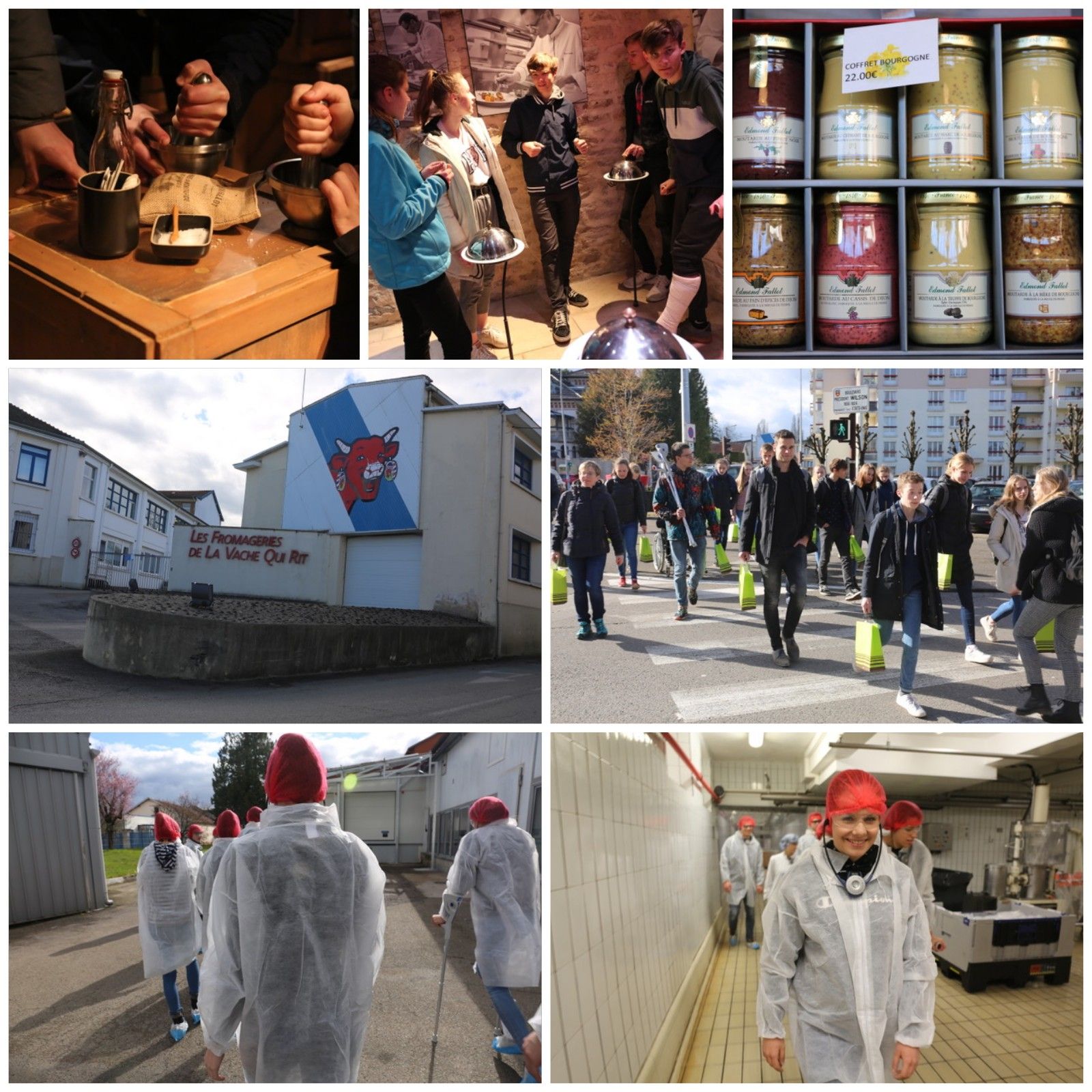 Am dritten Tag der Reise erlebten wir zwei reguläre Unterrichtsstunden an unserer Partnerschule, dem Collège Notre Dame de Mont Roland, samt Empfang beim Schuldirektor, Herrn Olivier Riant. Anschließend gab es einen kurzen Spaziergang durch den mittelalterlichen Stadtkern von Dole und zu Mittag aßen wir mit unseren Corres in der Kantine der Schule. In der Pause mussten wir leider unseren zweiten Verletzten beklagen. Cornelius knickte ebenfalls um. Wie Angelina musste sich nun auch Cornelius an Krücken oder Rollstuhl gewöhnen. Nach der Mittagspause ging es in die städtische Schmelzkäsefabrik, in der u. a. der Schmelzkäse La vache qui rit hergestellt wird. Hier nahmen wir an einer Führung durch das Gebäude teil und besichtigten die verschiedenen Linienproduktionen. Anschließend verbrachten wir wieder Zeit mit unseren Gastfamilien. Tag vier war für einen Ausflug in die naheliegenden Städte Beaune und Dijon vorgesehen. Am ersten Stopp in Beaune besuchten wir ein altes Hospiz und bekamen eine Führung durch eine der Senffabriken der Stadt. Bei dieser Gelegenheit erhielten wir viele Informationen über die Senfpflanze sowie die französische Senfproduktion, konnten uns selbst in der Herstellung von Senf ausprobieren und am Ende natürlich verschiedene Senfsorten verkosten.