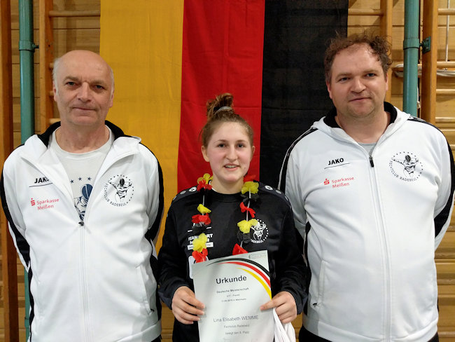 Als absolute Überfliegerin des Turniers präsentierte sich Lina Wemme. Kaltschnäuzig und mutig focht sie sich auf den 8. Platz der Meisterschaften. Nach einer soliden Vorrunde auf Platz 42 gesetzt, zündete die junge Sportschülerin den “Turbo” und fegte einige namenhafte Fechterinnen aus dem Turnier. Vor allem der 15:6 Sieg im 32er Direktausscheid gegen die Münchnerin Anna Kothieringer, war so nicht zu erwarten. Im Achtelfinale siegte Wemme dann ebenfalls klar gegen die Moerserin Celine Pachmann. Erst im Viertelfinale konnte sie von der späteren Vizemeisterin Sinem Katkay aus Tauberbischofsheim gestoppt werden. “Diese Leistung hat sich über die Saison nicht abgezeichnet, aber Lina hat in den letzten Wochen gut trainiert und hat hier keine Nerven gezeigt. Diese Stärke hat sie ins Finale gebracht.” so Trainer Robert Peche.