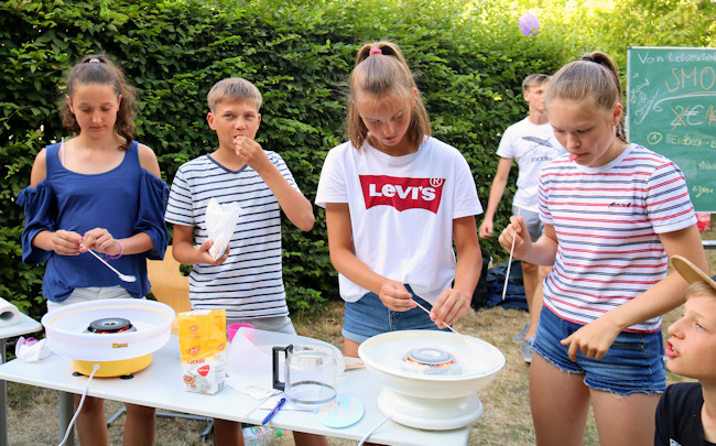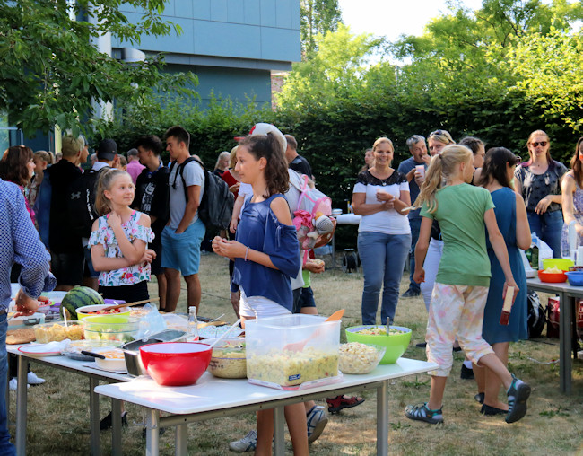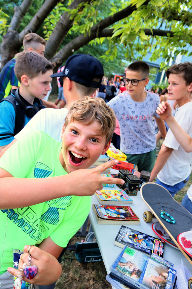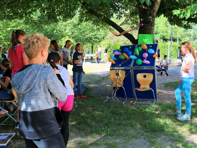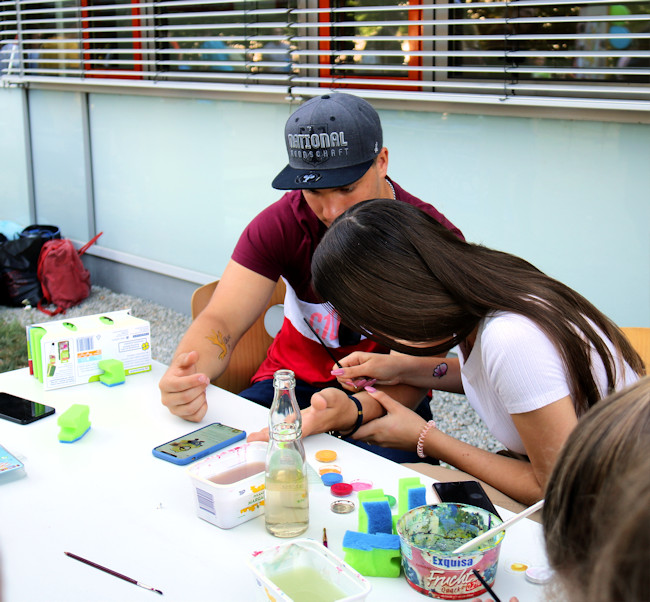 Ab 17 Uhr fand dann bei schönstem Sommerwetter im Garten das Schulfest statt. Zahlreiche Klassen hatten Stände mit Leckereien, etwa Bratwürsten, Kuchen oder Zuckerwatte vorbereitet, andere boten Spiele an. Sogar Tattoos konnte sich der eine oder andere professionell aufbringen lassen – abwaschbar natürlich.