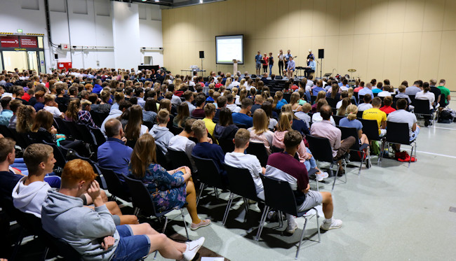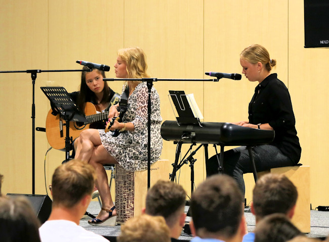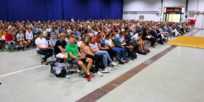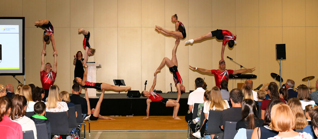 Nach diesem turbulenten Donnerstag folgte am Freitag die große Auszeichnungsveranstaltung in der Messe. Viele geladene Gäste ehrten die sportlichen und schulischen Leistungen unserer Eliteschüler. Umrahmt wurde das Programm von musikalischen Beiträgen der 5. Klassen sowie der Musikkurse. Natürlich fehlten auch die Akrobaten nicht. Für ihre Show richtete das Publikum wieder gern den Blick in Richtung Decke.
