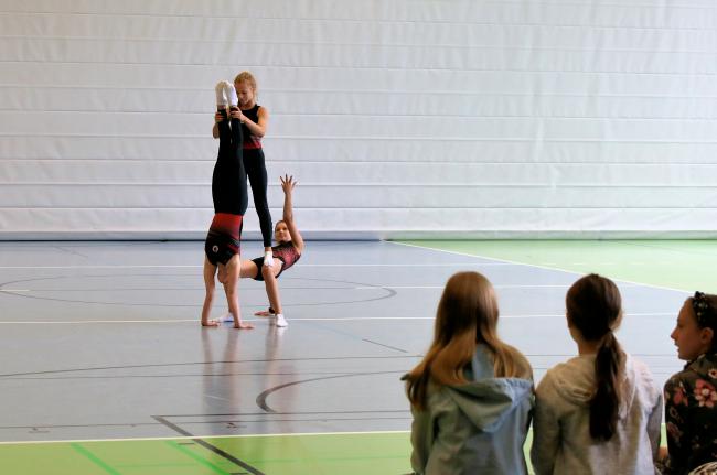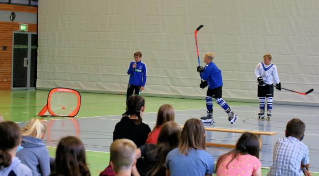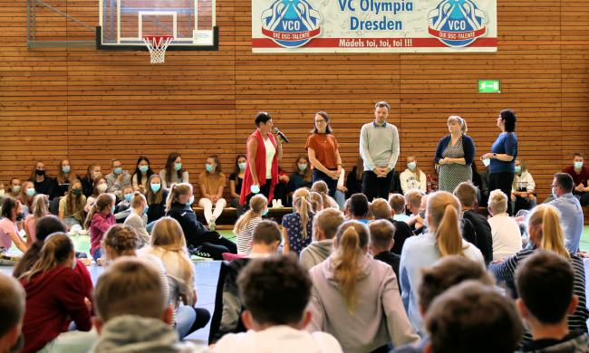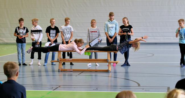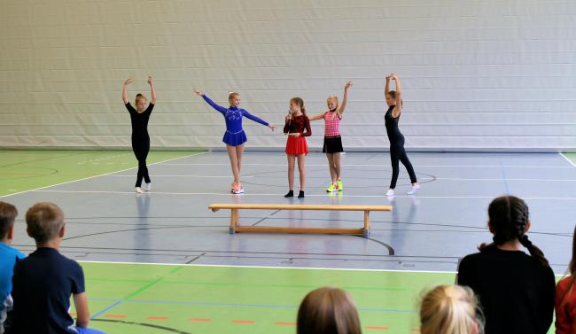Die drei neuen 5. Klassen wurden von Frau Göldner und Frau Reif sowie ihren Klassenleiterinnen Frau Haenelt (5/1), Frau Triemer (5/2) und Frau Weber (5/3) herzlich in Empfang genommen. Unsere jetzigen 6. Klassen gaben damit den Titel der Jüngsten ab und präsentierten den neuen Schülerinnen und Schülern sowie ihren Eltern ihre Sportarten. Erstaunlich, dass Schwimmen, Eishockey und Eiskunstlauf auch in der Turnhalle funktionieren! Vielen Dank für euer Programm.