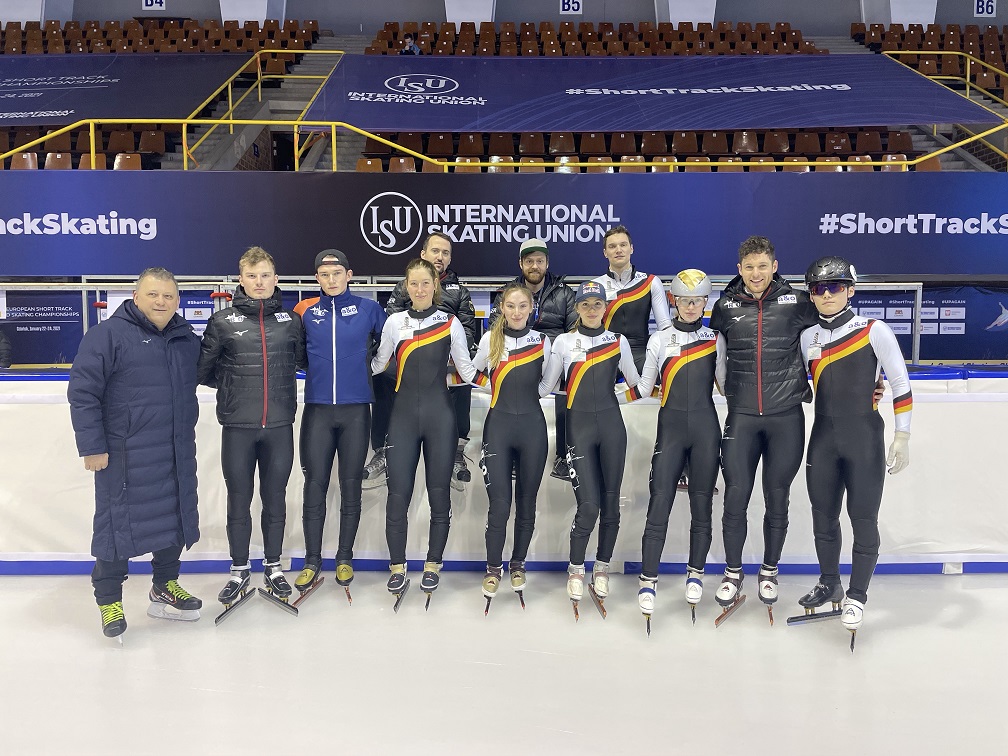 Die Presse berichtete vorab und zeigte die Sportler mit den entsprechenden Erwartungen. Aufwarten konnte das Deutsche Team mit einer kompletten Mannschaft von 5 Männern und 4 Damen. Mit dabei waren Lisa Eckstein (Kl. 13S), Anna Katharina Gärtner (Abschlussklasse ´19/20) und Gina Jacobs um die Vorzeigeathletin Anna Seidel (alle EVD e.V.). Bei den Herren verstärkte Ben Jung (Kl. 9S2) das Team um die Herren Christoph Schubert, Tobias Pietzsch (bd. EVD e.V.) und Luca Löffler den aussichtsreichsten Deutschen Adrian Lüdtke. Mit dem Bundestrainer Stuart Horsepool ging die Reise bereits ein paar Tage eher nach Polen. Er hatte das Team intensiv und punktgenau vorbereitet. Erwartungsvoll waren die Teilnehmer an die sonst routinierten Abläufe heran gegangen und etwas Lampenfieber schwang lt. Gina Jacobs schon mit (Artikel DNN „EM wird für die Shorttracker eine große Wundertüte“).