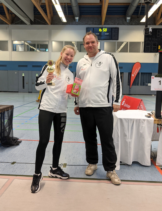 Michael Bergert, aktuell noch in der U15 startberechtigt, focht eine sehr gute Vorrunde mit vier Siegen im Feld der U20. Im Direktausscheid bezwang er zunächst Niklas Zacher aus Jena mit 15.14. Dann kam es zum vereinsinternen Duell gegen Gregor Schmitz-Hübsch. Hier zeigte Sportgymnasiast Bergert, dass in Zukunft mit ihm zu rechnen ist. Er bezwang seinen vier Jahre älteren Teamkollegen mit 15:10 und rutschte kurz vor dem ersten Europapokalturnier in Esslingen in die Top 20 der Deutschen U17 Rangliste. „Damit kann Michael nächste Woche neben dem Einzel in einem der fünf möglichen Nationalteams mitfechten. Eine super Gelegenheit für ihn sich zu präsentieren. “ sagte Trainer Hubert Peche.