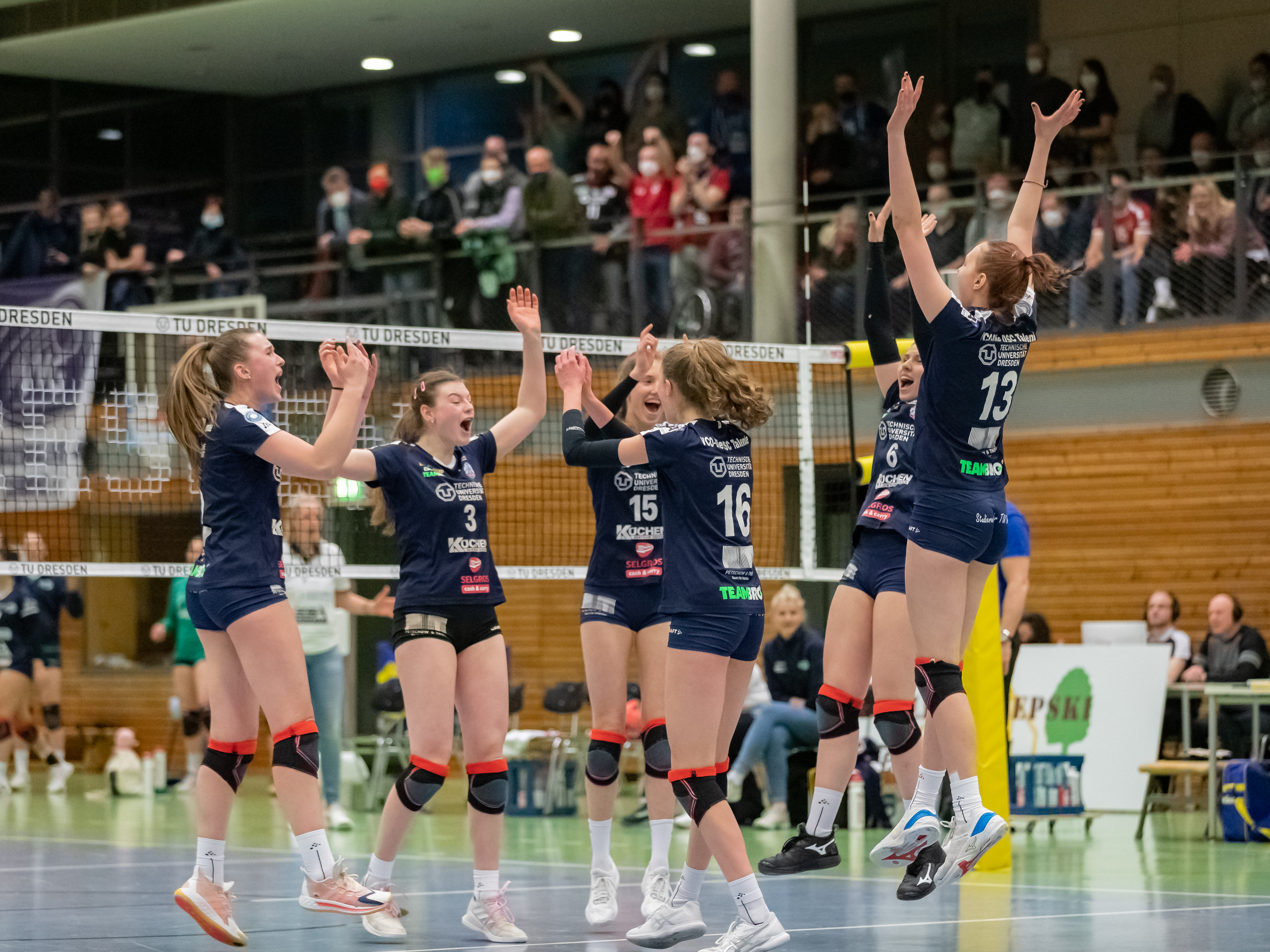 Im vierten Satz ging Grimma noch einmal voll auf Angriff. Bis zur Satzmitte konnten die Sachsen Volleys ihren 4-Punkte-Vorsprung halten. Die Gäste agierten stärker am Netz, auch wenn die beiden Dresdner Youngster Jarisch und Pfeffer auch in diesem Satz immer wieder mit einzelnen Aktionen glänzen konnten. Doch auch diesmal konnte Grimma seine Dominanz nicht aufrechterhalten. „Wir waren heute einfach nicht konstant. Wir spielten phasenweise sehr gut, aber konnten es dann nicht durchziehen“, fasste es Trainerin Kristin Stöckmann später zusammen. Und so kämpfte sich Dresden wieder heran, schaffte beim 15:15 den Ausgleich und übernahm dank sehr guter Aufschläge von Hannah Kögler bei 20:19 erstmals die Führung. Grimma konnte sich nicht noch einmal fangen und musste Satz und Spiel mit 25:21 verloren geben.