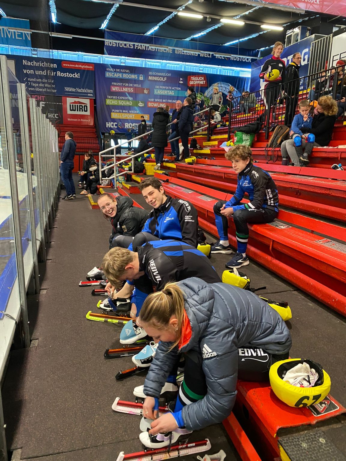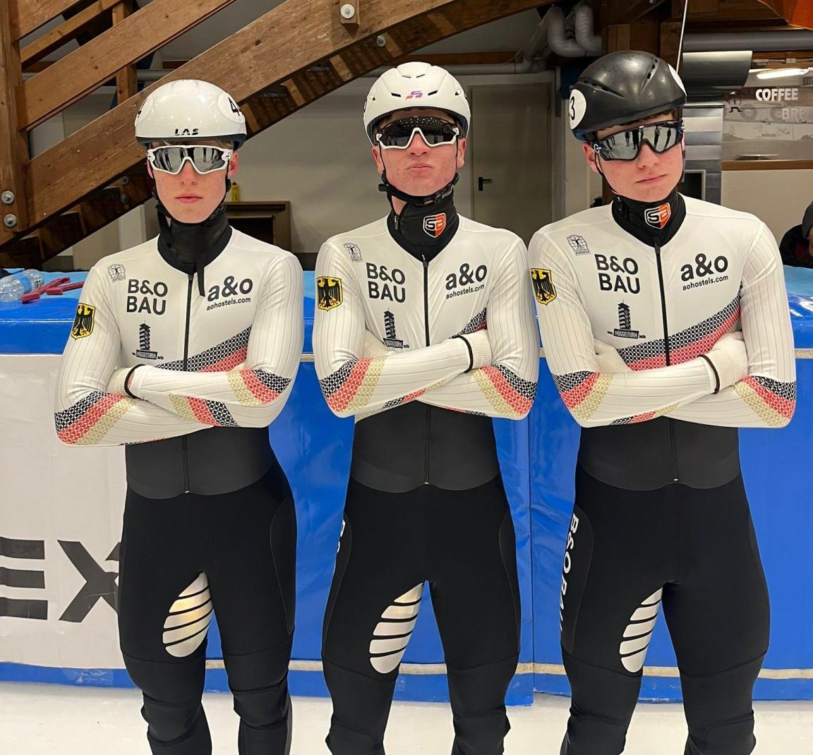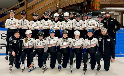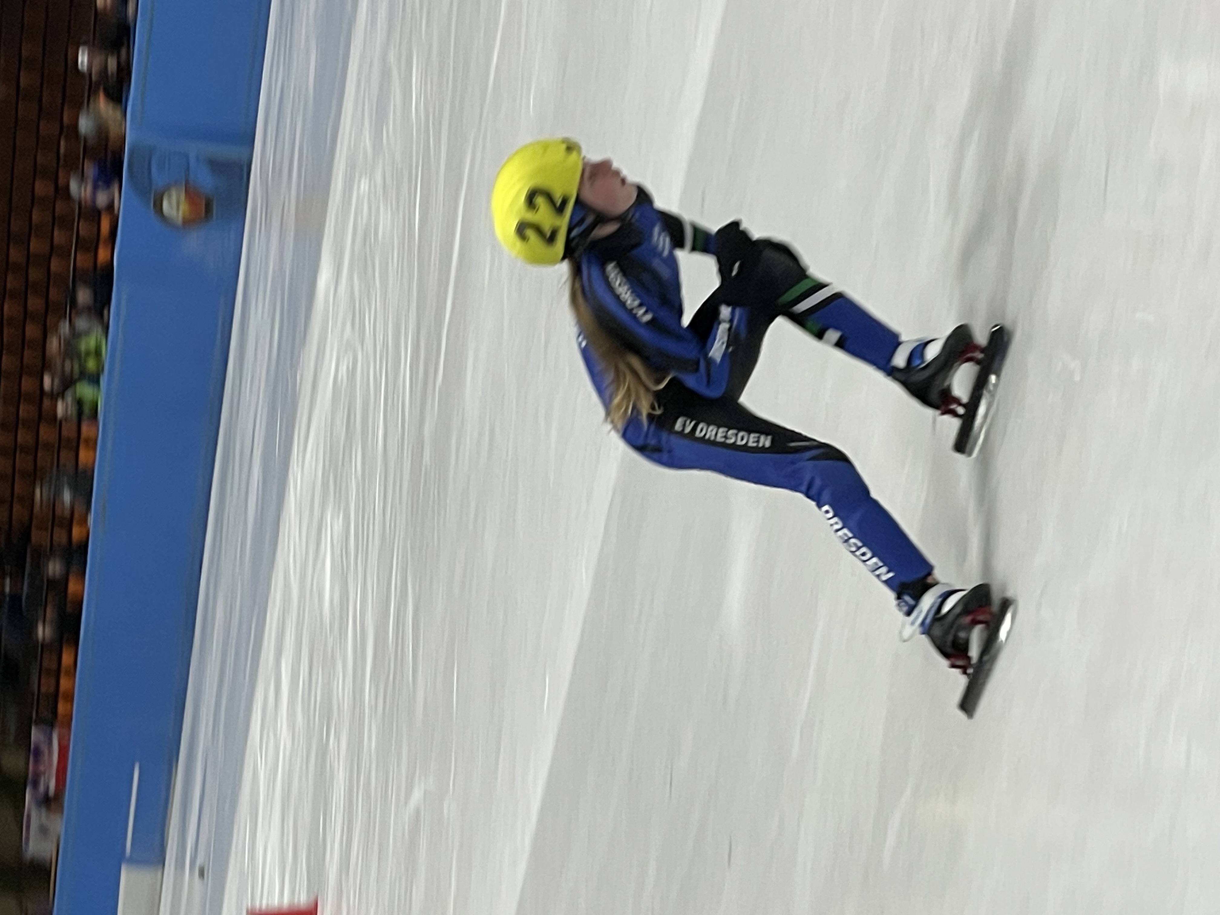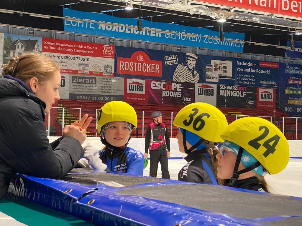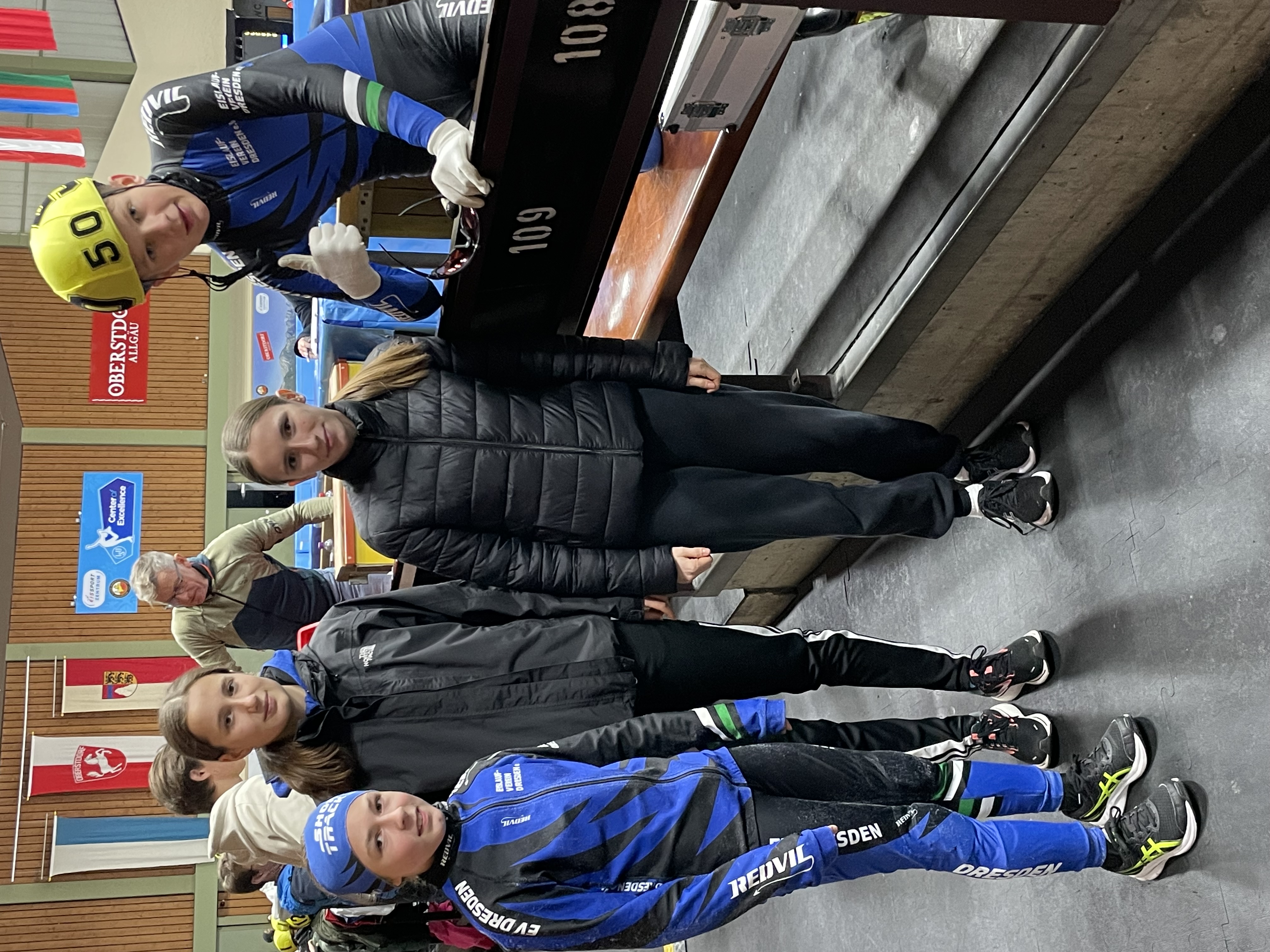 Team Dresden in der Eishalle (Maxi Hollwitz (6/2), Alessia Mielke (9/2), Klara Zoschke (8/2) und Hubert Jeziak (7/3) nach seinem Lauf