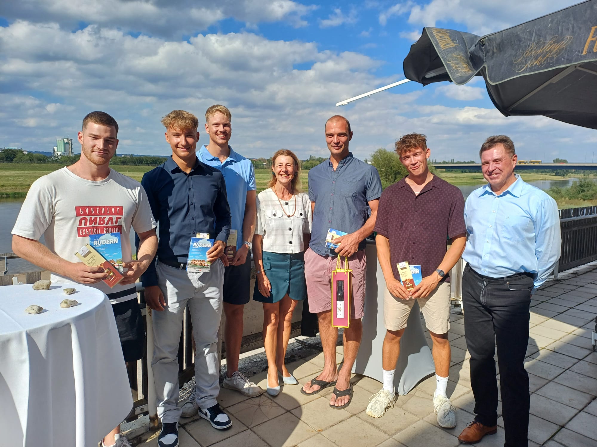Am Sonntag, den 11.08.24, wurden Carl Sgonina (ehemaliger Schüler der OS), Tom Olbrich und Franz Rudolph (Sportgymnasium) im Bootshaus Cotta verabschiedet. Holger Hoffmann (Präsident Landesruderverband Sachsen e.V.) begrüßte die Sportler und Gäste. Anwesend waren auch Vertreter der Heimatvereine (TU Dresden, DRV und DRC), der Schulen (Frau Bitterlich und Frau Reif) und der Stadt Dresden (Herr Donhauser – Sportbürgermeister) sowie weitere Sportbegeistere unserer Stadt. Felix Krones und Johann Svoboda konnten leider nicht an der Veranstaltung teilnehmen. Sie waren bereits auf dem Weg zum Wettkampf. Tim Grohmann wird unsere Sportler als Trainer begleiten. Franz Werner wird bei den Weltmeisterschaften im Costal Rowing in Genua vom 06.09. bis 08.09.2024 an den Start gehen. Diese Variante des Ruderns wird 2028 zum ersten Mal einen Olympiasieger ermitteln. Wir sind stolz auf unsere Jungs und wünschen ihnen ganz viel Erfolg! „Riemen und Dollenbruch“ ….